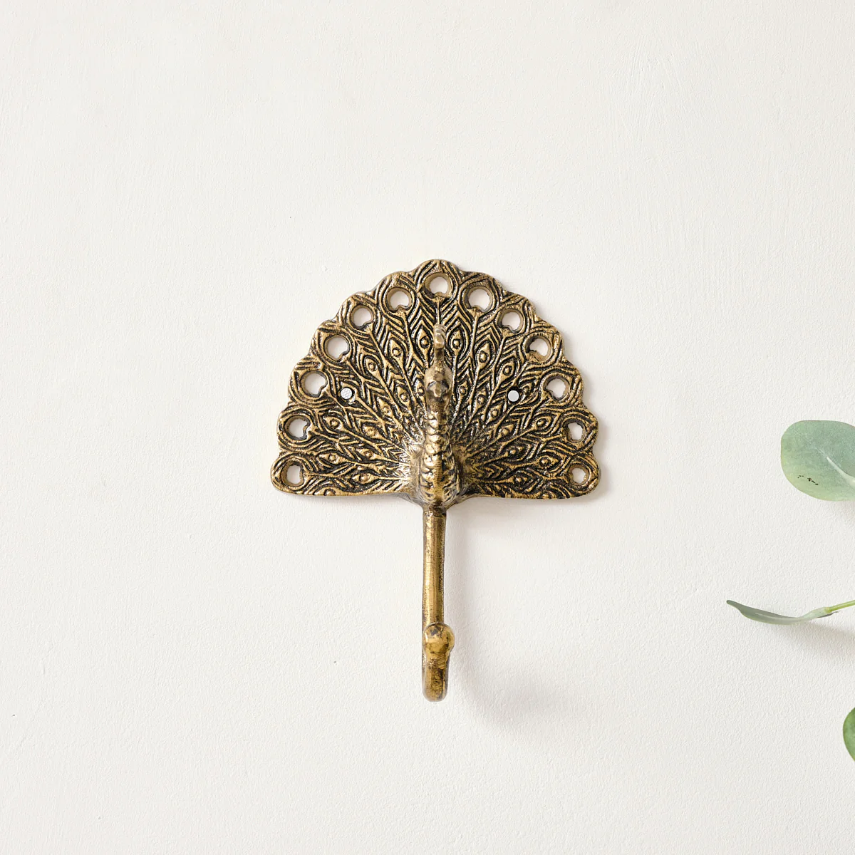 This Antique Brass Gold Peacock Wall Hook is a quirky, vintage inspired accessory ideal for fans of animal inspired decor and antique finishes. Made of metal, this wall hook has a fanned peacock design and an antique brass gold finish.