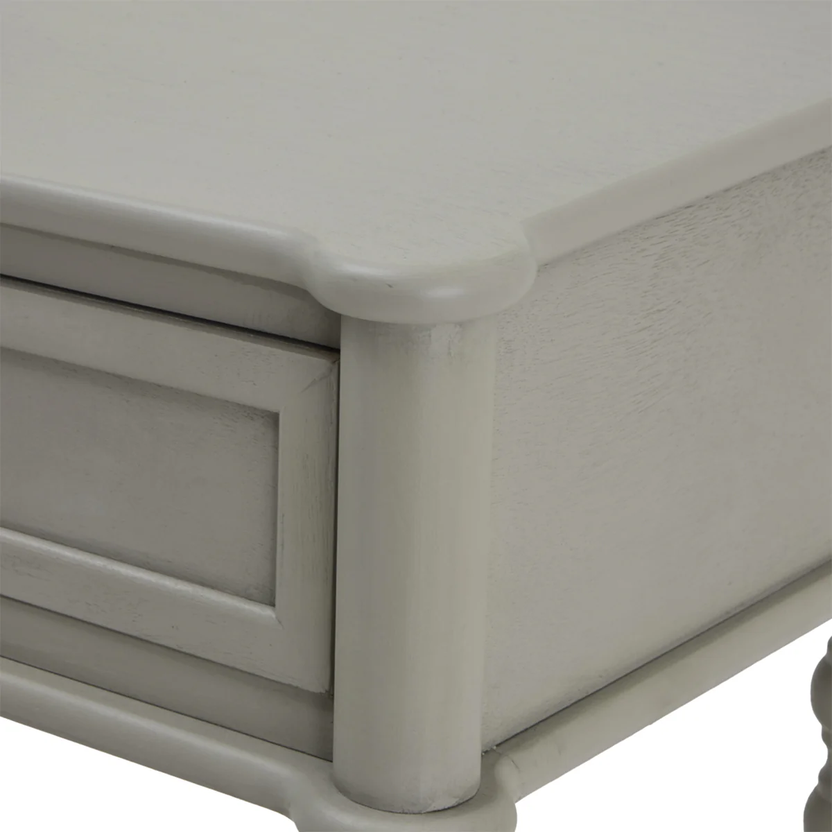 This Grey Bobbled 2 Drawer Console Table/Sideboard is a well crafted, beautiful storage table, perfect for placing in a bedroom, hallway or dressing room space. Made of solid wood and metal, this console table has a two drawer design. This piece comes with bobbled detailing and a light grey finish.