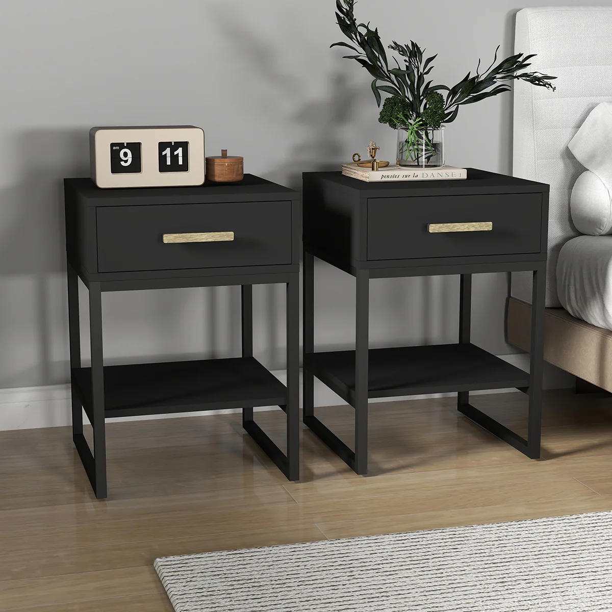 This Large 3 Drawer Chest Of Drawers & Pair Of One Drawer Bedside Tables from the Luna Black Range is a beautiful, contemporary storage set, ideal for fans of minimalist design and fluted detailing. Made of manufactured wood and metal, this chest comes with 3 large storage drawers and the pair of bedside tables come with one spacious drawer and one display shelf. They have a painted black finish on the front and hammered gold metal handles.