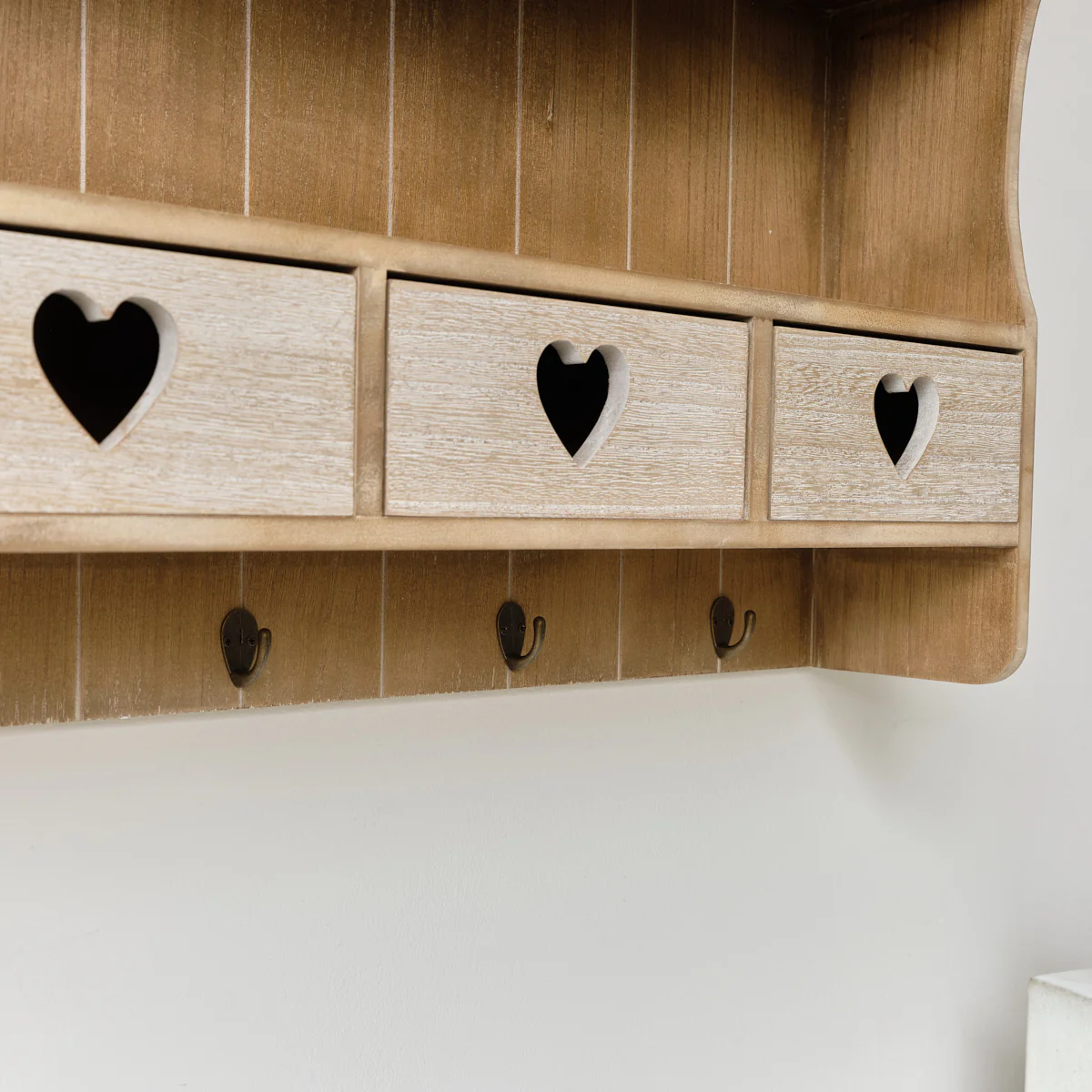 Large Rustic Wooden Wall Shelving Unit with Heart Drawers & Storage Hooks