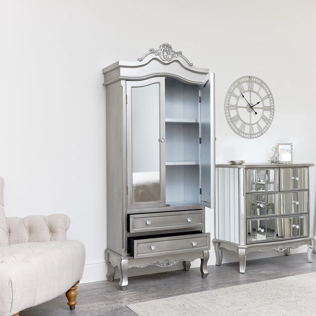 This wonderful french styled mirrored wardrobe is a marvellous statement piece, a perfect addition to any bedroom, dressing area or children’s room. Finished in a beautiful antique silver mirrored design adds a luxurious ornate feel to your home. The full length mirrored doors help to bring extra light to your room while also offering full view for outfit checks before leaving the house. Inside this wardrobe are three spacious shelves perfect for neatly organising your clothing and accessories for easy access! Below the main wardrobe are two spacious drawers also ideal for storing smaller clothing or accessories! This wardrobe easily blends in with any interior theme and works around your existing room colours to help enhance it’s surroundings and make your room pop! Browse our full Tiffany Range for more furniture pieces!
