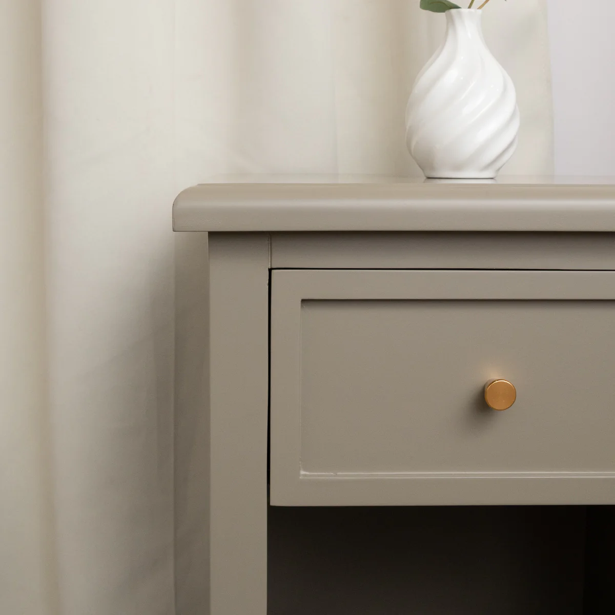 This One Drawer Scalloped Bedside Table from the Staunton Taupe Range is a stylish yet simple bedside table, ideal for placing next to a bed, sofa or in a hallway. This table is made of wood and comes with a warm, taupe grey painted finish, scalloped detailing and gold metal handles.